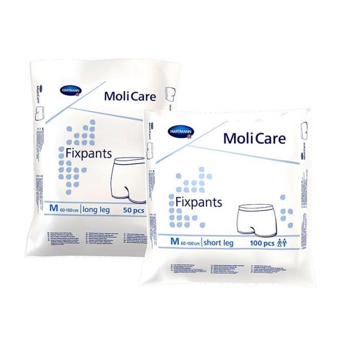 MoliCare Fixpants (model cu picior scurt) – Pantalonasi de fixare foarte elastici pentru utilizarea in combinatie cu tampoane pentru incontinenta de toate tipurile. Realizati dintr-un material usor, moale si permeabil la aer, cu o structura densa tip plasa si foarte rezistenta. Identificarea marimii se face foarte usor cu ajutorul benzilor colorate tesute in betelia pantalonasilor.
