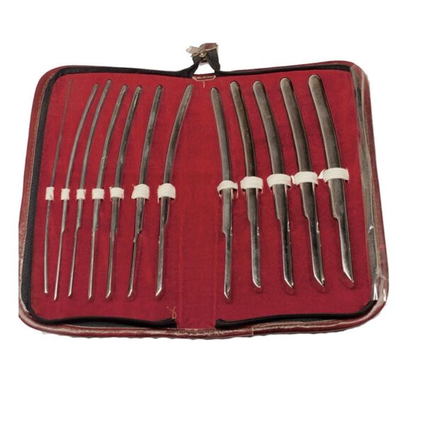Set dilatatoare Hegar 12 bucati – dilatatoare cu diametre diferite utilizate in diverse proceduri de specialitate. Pe fiecare dilatator, pe manerul acestuia, este inscriptionat un numar – jumatati de numere de la 3,5; 4,5; 5,5…la 14,5. Dilatatoarele sunt fabricate din otel inox.